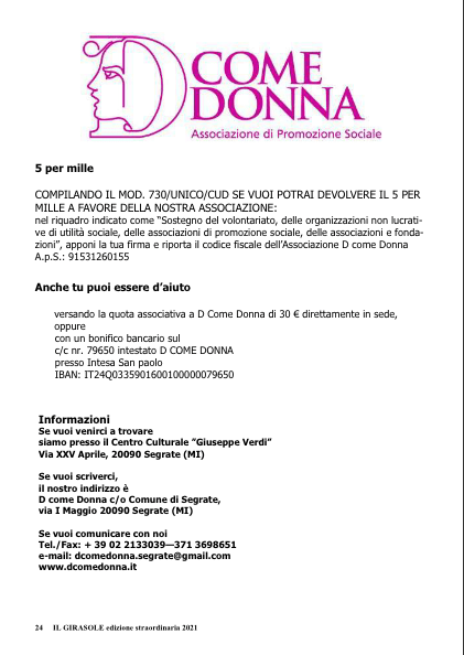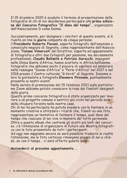 Archivio, Il Girasole, iniziative, Memorie IL GIRASOLE EDIZIONE STRAORDINARIA Pubblicato da D come Donna il febbraio 3, 2021febbraio 19, 2021 Questa edizione straordinaria del nostro notiziario “Il Girasole” è dedicato alla prima edizione del Concorso Fotografico ”Il dono del tempo”. Troverete non solo le foto dei vincitori ma anche una selezione delle migliori istantanee. Condividi: Condividi su X (Si apre in una nuova finestra) X Condividi su Facebook (Si apre in una nuova finestra) Facebook Mi piace Caricamento... Correlati Pubblicato da D come Donna D Come Donna è un associazione di promozione Sociale con Sede a Segrate (MI) Vedi tutti gli articoli di D come Donna