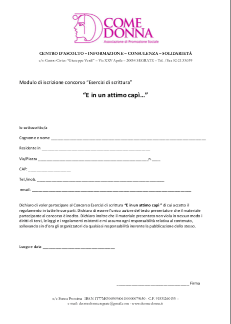 Il file del racconto dovrà essere inviato alla mail dcomedonna.segrate@gmail.com in formato word.