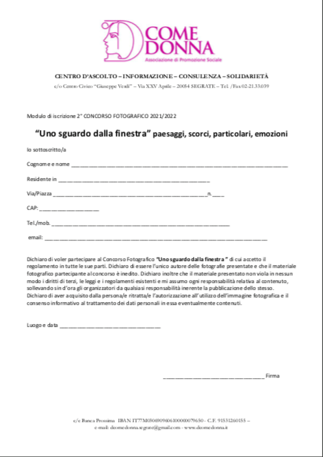 CAUSALE: Nome del concorrente, Concorso fotografico “Uno sguardo dalla finestra”