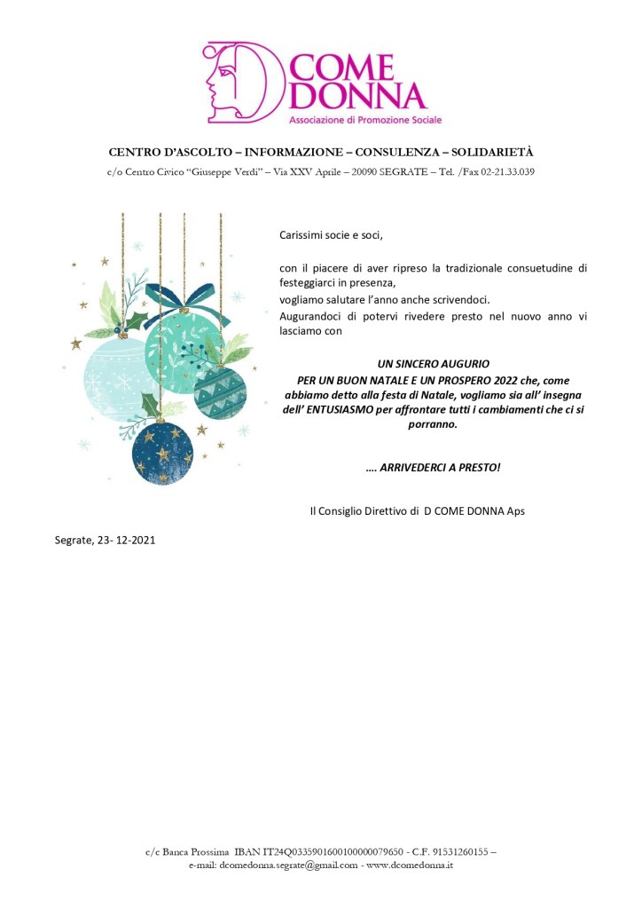 Uncategorized Pubblicato da D come Donna il dicembre 24, 2021 Condividi: Condividi su X (Si apre in una nuova finestra) X Condividi su Facebook (Si apre in una nuova finestra) Facebook Mi piace Caricamento... Correlati Pubblicato da D come Donna D Come Donna è un associazione di promozione Sociale con Sede a Segrate (MI) Vedi tutti gli articoli di D come Donna