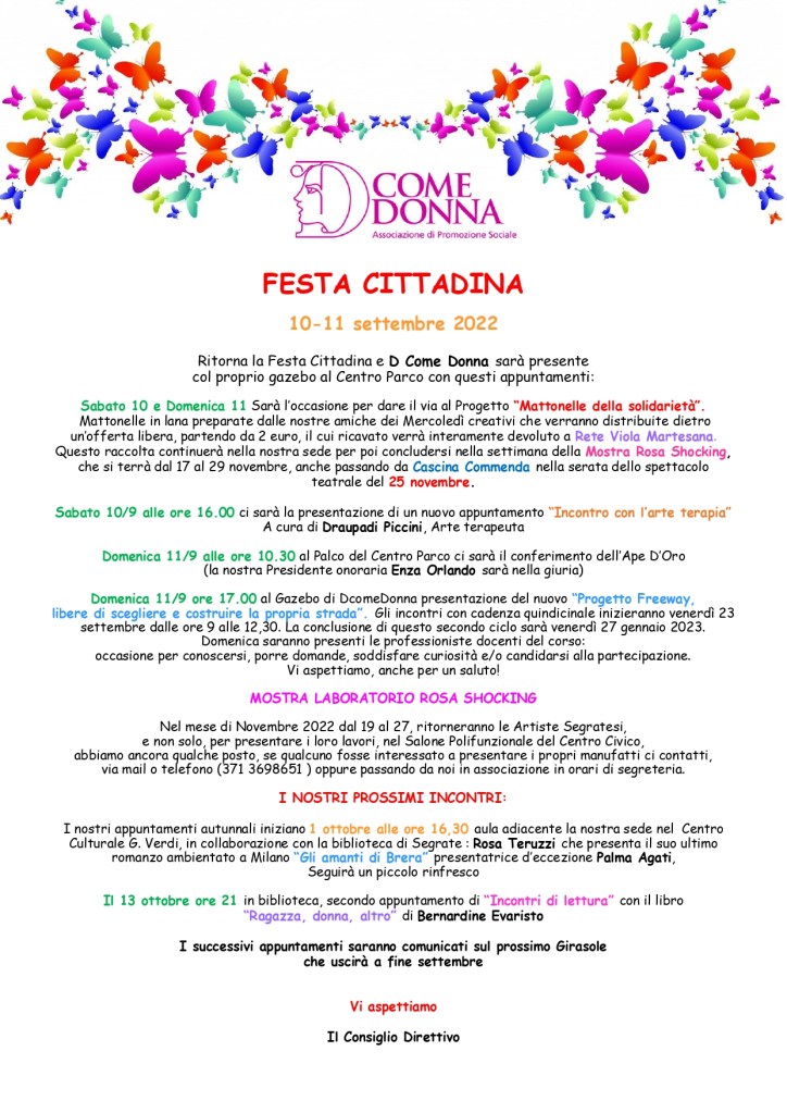 Eventi in piazza, Festa, iniziative, Memorie, Uncategorized Pubblicato da D come Donna il settembre 5, 2022settembre 5, 2022 Condividi: Condividi su X (Si apre in una nuova finestra) X Condividi su Facebook (Si apre in una nuova finestra) Facebook Mi piace Caricamento... Correlati Pubblicato da D come Donna D Come Donna è un associazione di promozione Sociale con Sede a Segrate (MI) Vedi tutti gli articoli di D come Donna