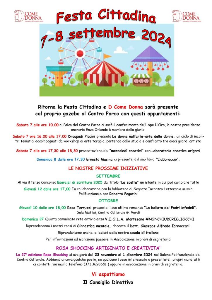 Uncategorized Festa Cittadina Pubblicato da D come Donna il settembre 7, 2024 Centro Parco Segrate Condividi: Condividi su X (Si apre in una nuova finestra) X Condividi su Facebook (Si apre in una nuova finestra) Facebook Mi piace Caricamento... Correlati Pubblicato da D come Donna D Come Donna è un associazione di promozione Sociale con Sede a Segrate (MI) Vedi tutti gli articoli di D come Donna