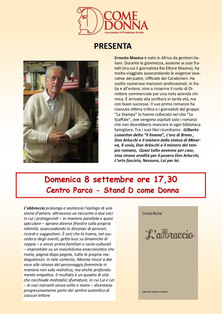 Uncategorized Presentazione del libro ” L’abbraccio ” di Ernesto Masina Pubblicato da D come Donna il settembre 8, 2024 Condividi: Condividi su X (Si apre in una nuova finestra) X Condividi su Facebook (Si apre in una nuova finestra) Facebook Mi piace Caricamento... Correlati Pubblicato da D come Donna D Come Donna è un associazione di promozione Sociale con Sede a Segrate (MI) Vedi tutti gli articoli di D come Donna