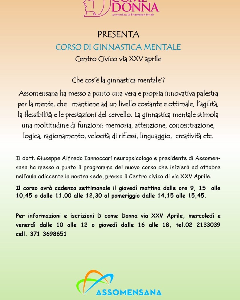 Uncategorized Ginnastica Mentale a cura di Assomensana Pubblicato da D come Donna il settembre 18, 2024 10a edizione – 3 classi tutti i giovedì Condividi: Condividi su X (Si apre in una nuova finestra) X Condividi su Facebook (Si apre in una nuova finestra) Facebook Mi piace Caricamento... Correlati Pubblicato da D come Donna D Come Donna è un associazione di promozione Sociale con Sede a Segrate (MI) Vedi tutti gli articoli di D come Donna