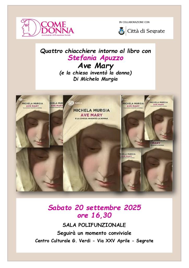 Uncategorized “AVE MARY” Pubblicato da D come Donna il settembre 16, 2025 di Michela Murgia Quattro chiacchiere intorno ad un libro Condividi: Condividi su X (Si apre in una nuova finestra) X Condividi su Facebook (Si apre in una nuova finestra) Facebook Mi piace Caricamento... Correlati Pubblicato da D come Donna D Come Donna è un associazione di promozione Sociale con Sede a Segrate (MI) Vedi tutti gli articoli di D come Donna