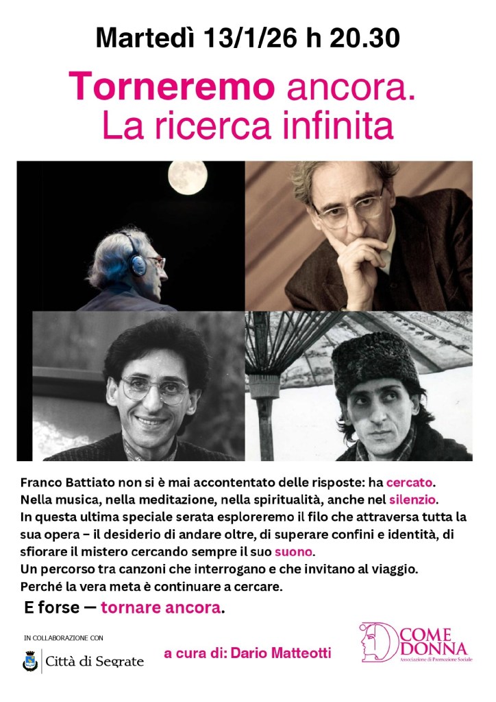 Uncategorized Franco Battiato Pubblicato da D come Donna il gennaio 8, 2026gennaio 8, 2026 Presenta Dario Matteotti Condividi: Condividi su X (Si apre in una nuova finestra) X Condividi su Facebook (Si apre in una nuova finestra) Facebook Mi piace Caricamento... Correlati Pubblicato da D come Donna D Come Donna è un associazione di promozione Sociale con Sede a Segrate (MI) Vedi tutti gli articoli di D come Donna