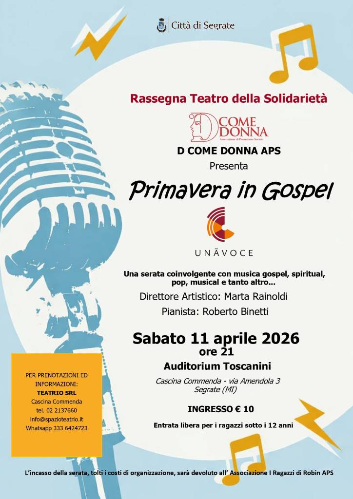 Uncategorized Primavera in Gospel Pubblicato da D come Donna il aprile 3, 2026 Condividi: Condividi su X (Si apre in una nuova finestra) X Condividi su Facebook (Si apre in una nuova finestra) Facebook Mi piace Caricamento... Correlati Pubblicato da D come Donna D Come Donna è un associazione di promozione Sociale con Sede a Segrate (MI) Vedi tutti gli articoli di D come Donna