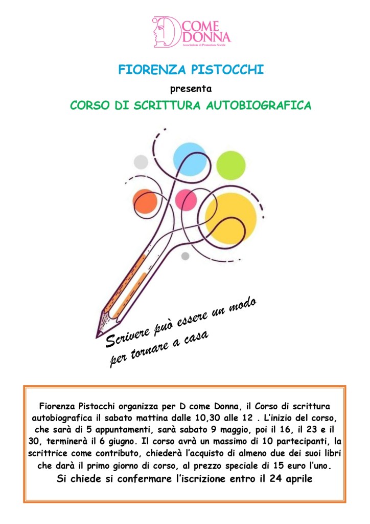 Uncategorized Corso di scrittura autobiografica Pubblicato da D come Donna il aprile 9, 2026 di Fiorenza Pistocchi Condividi: Condividi su X (Si apre in una nuova finestra) X Condividi su Facebook (Si apre in una nuova finestra) Facebook Mi piace Caricamento... Correlati Pubblicato da D come Donna D Come Donna è un associazione di promozione Sociale con Sede a Segrate (MI) Vedi tutti gli articoli di D come Donna